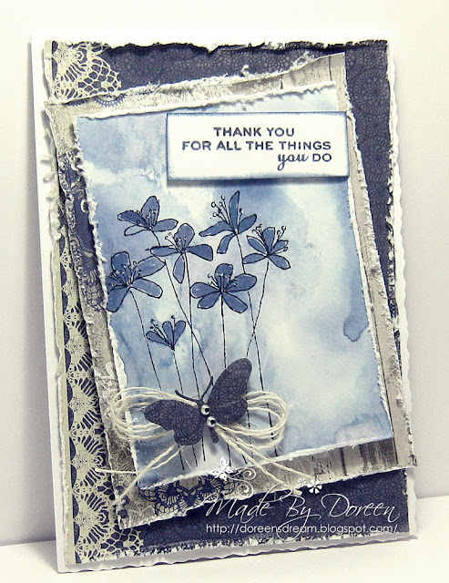 A really lovely card, Doreen! A touch of lace, distressed edges, beautiful watercolor!